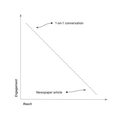 Reach and engagement tend to be inversely correlated - the wider the reach, the lower the engagement. For example, talking to a person is low reach/high engagement. A TV appearance is high-reach/low-engagement.