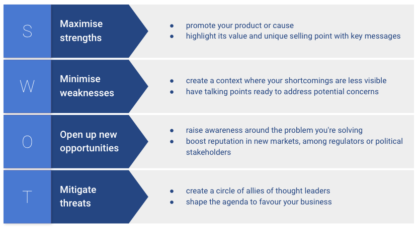 mitigating threats to the business, e.g. creating a circle of allies of thought leaders, shaping the agenda to favour your business