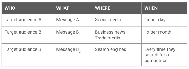 You have separate messages for each audience, and B’s message varies a little based on your channel.